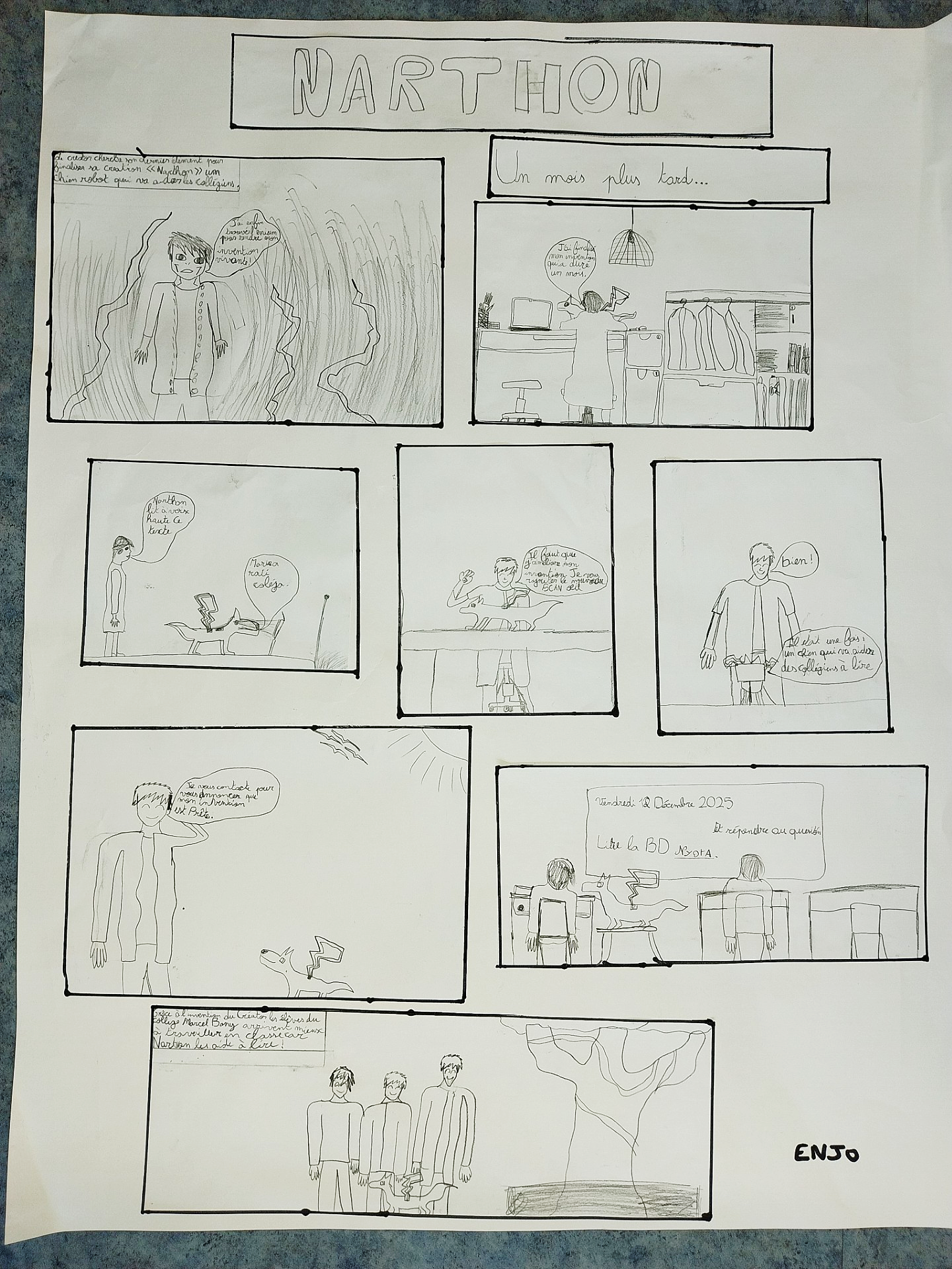 Ma BD parle d’un scientifique qui s’appelle le Créator. Il invente un chien robot, Narthon qui va aider les collégiens en difficulté à lire.
